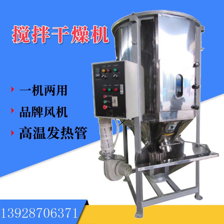 立式攪拌干燥機主要用于多種顏色塑料顆粒的混合,干燥機是注塑機、造粒機的必備配套設備之一,塑料粒子從進料斗進入,在螺旋葉片推進力的作用下,沿著葉片表面向上滑動前進在上部的離心力的作用下,向桶體四周散開,散開的物料不斷向下移動,由循環(huán)出料口和桶內循環(huán)料口不斷被螺旋葉片帶動提升。這樣反復循環(huán),達到混合目的,與此同時空氣經鼓風機送至電加熱箱中,加熱后成為熱風再 經溫控表自動控制,以均勻適合的熱風從樹脂之間一路穿透,穿過物料層,進行熱交替不斷帶走濕氣,樹脂粒子由上而下,下降過程中連續(xù)不斷得到吹掃干燥,完成高效率干燥和混合工藝。
